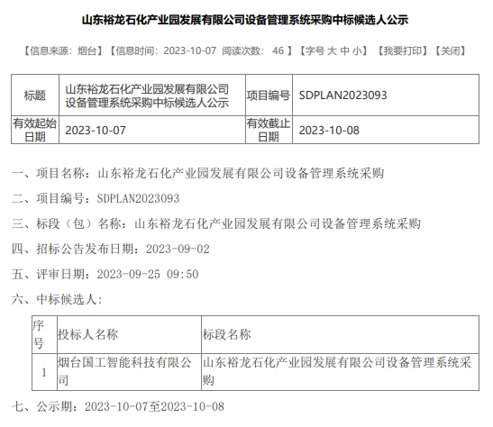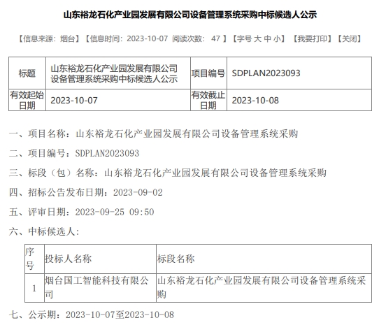山東裕龍石化產(chǎn)業(yè)園發(fā)展有限公司設(shè)備管理系統(tǒng)采購(gòu)項(xiàng)目: