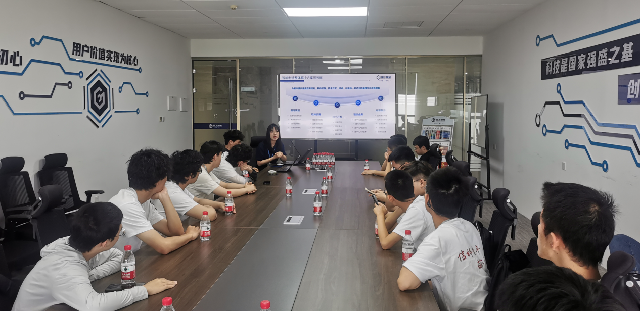 在參觀伊始,國工智能的人力行政總監林海波先生熱情接待了來訪師生,圍繞公司展墻簡要介紹了公司的核心產品、前沿技術、標志性客戶案例以及發展歷程。林總監特別強調了國工智能在知識產權保護方面所構建的堅實“護城河”,展現了公司在技術創新與市場競爭力方面的深厚底蘊。
