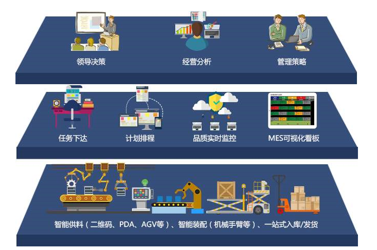 MES屬于ERP計劃層和車間層操作控制系統之間的執行層,主要負責生產管理和調度執行。它不單是面向生產現場的系統,而是作為上、下兩個層次之間雙方信息的傳遞系統,是連接現場層和經營層,改善生產經營效益的前沿系統。它提供了一個能夠集成諸如:訂單執行與跟蹤、質量控制、生產調度、物料投入產出管理等功能的的系統平臺,能夠實現ERP系統無法實現的實時生產管理報表功能。
