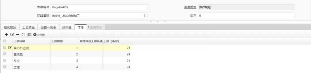 產(chǎn)品LB32自制加工的生產(chǎn)工序要求如下所示,需要4個(gè)工序,每個(gè)工序24小時(shí),也就是1天。每個(gè)工序?qū)?yīng)該工序的所需操作功用,按照工序順序依次分別為吊帶離心、不銹鋼結(jié)晶、搪玻璃反應(yīng)、柱子過濾。