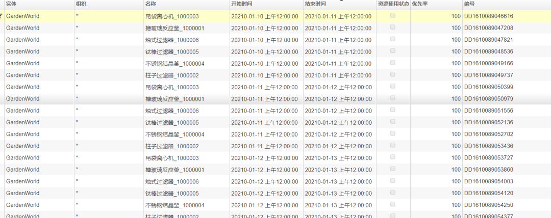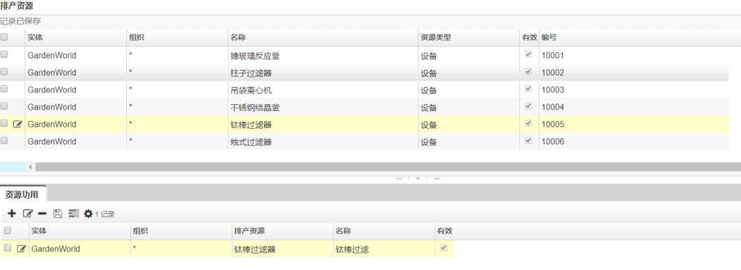 可用的排產(chǎn)資源如下圖,設(shè)備提供的資源功用分別對(duì)應(yīng)如下:搪玻璃反應(yīng)釜---搪玻璃反應(yīng)、柱子過濾器---柱子過濾、吊帶離心機(jī)--吊帶離心、不銹鋼結(jié)晶釜---不銹鋼結(jié)晶、鈦棒過濾器---鈦棒過濾、燭式過濾器---燭式過濾。