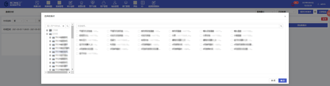 以某一特定設備為例,使用平臺數據分析功能,將平臺中的有效數據進行分析。根據用戶的需要,對一段時間內的歷史數據或實時數據按照一定的統計頻率進行多個維度的數據分析,統計頻率包含不限、10秒、30秒、5分鐘、10分鐘、30分鐘、1小時,通過添加變量操作,在彈出的變量選擇彈窗中可多選數據點信息,可以通過資產樹選中資產來選擇數據信息或者直接通過模糊搜索查找數據點。數據分析得到的圖表顯示形式包括折線圖以及表格形式。多個數據點信息圖表的展示形式包括平鋪、疊加、標簽顯示以及合并表格顯示,根據不同的需求選擇對應的展示形式,靈活性高。數據分析幫助用戶分析用戶想要分析的內容,如數據走向、問題等,從而幫助用戶解決問題。
