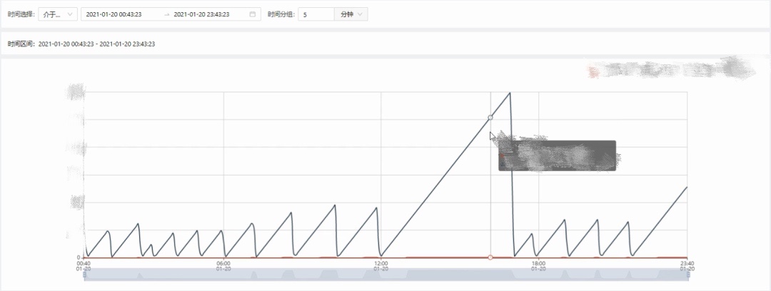 這是現場某一設備的濾網使用時間分析,按照正常的生產流程,要求單個濾網的使用周期不得超過60分鐘。從上圖的分析中我們可以看出,在早上6點鐘之前,濾網的更換較為頻繁,基本都在60分鐘以內。但在6點之后,濾網的更換周期基本在80~90分鐘,其中更是有一次使用時間達到了300分鐘,這就屬于嚴重超時,肯定會對產品質量產生影響,同時也可能會對設備產生磨損。