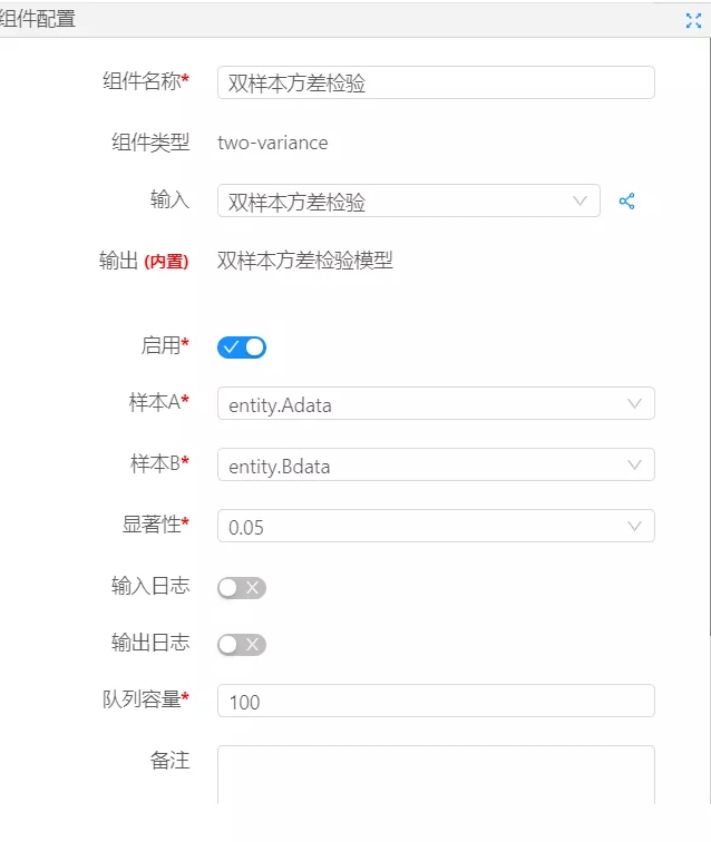 從數據大腦中的組件面板查找雙樣本方差檢驗組件,拖到到工作面板,配置數據,雙樣本方差檢驗組件參數,點擊運行。