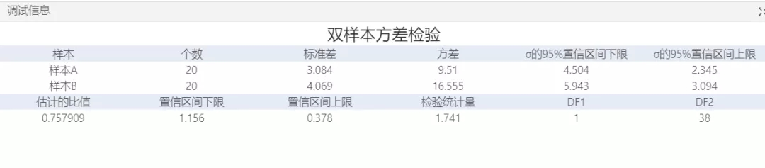 通過雙樣本方差檢驗來判斷兩個組的方差或標準差是否不同,并計算可能包括兩個組的方差或標準差的總體比值的值范圍,通過對樣本的標準差和方差比的95%置信區間來判斷該組數據是否具有比較有效性,以及通過p值來判斷結果的可信程度從而推斷該假設是否可以成立。