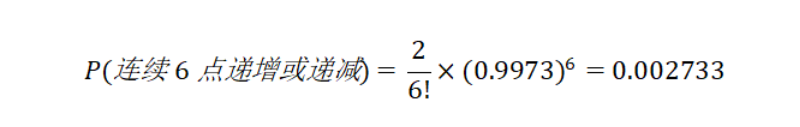 首先,當過程處于統(tǒng)計控制狀態(tài),6個連續(xù)的點不越界的概率很顯然是 () ,但是如果連續(xù)遞增或者遞減,則相當于一個排列組合的過程(遞增排列或遞減排列),因此,其概率僅有: